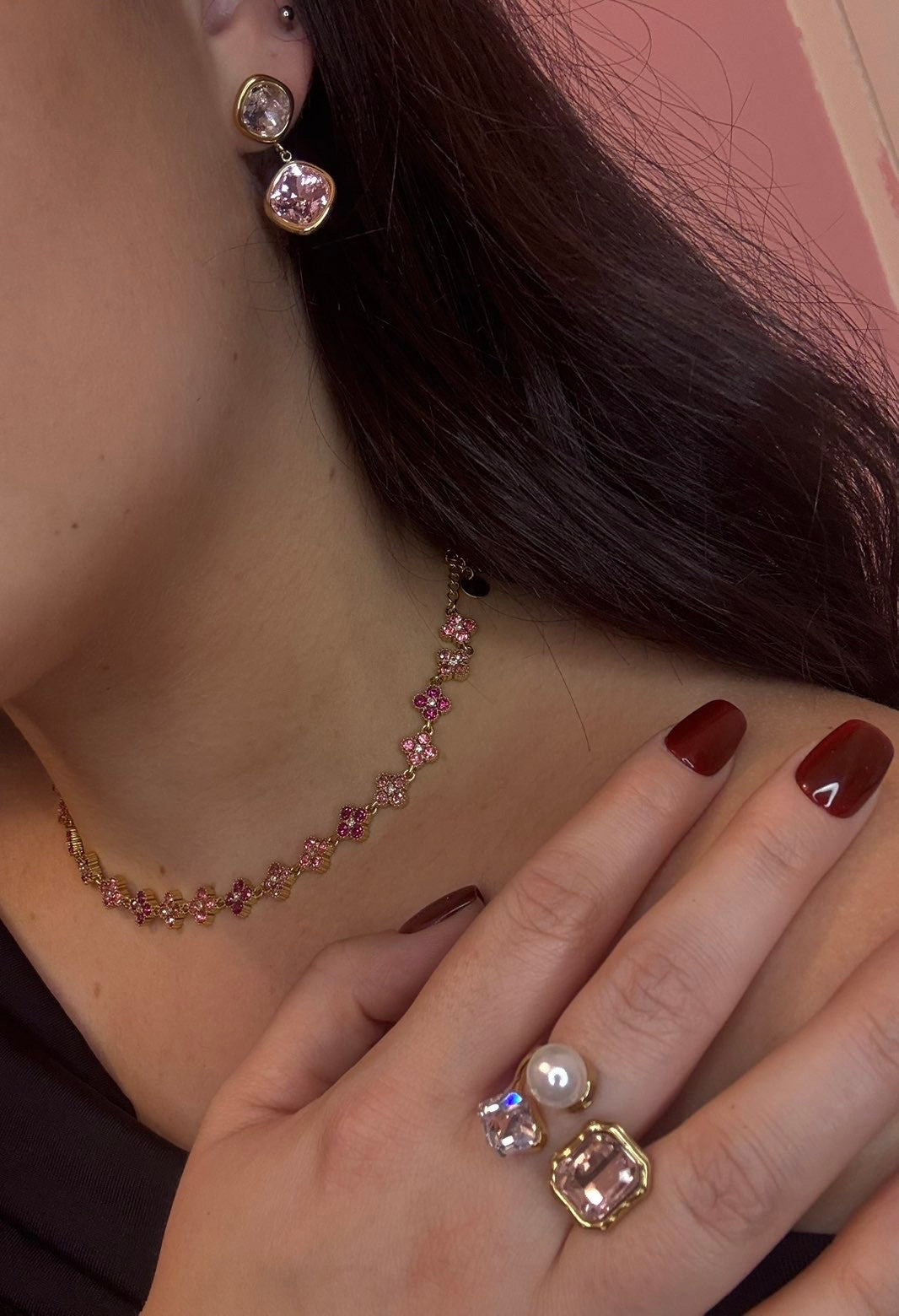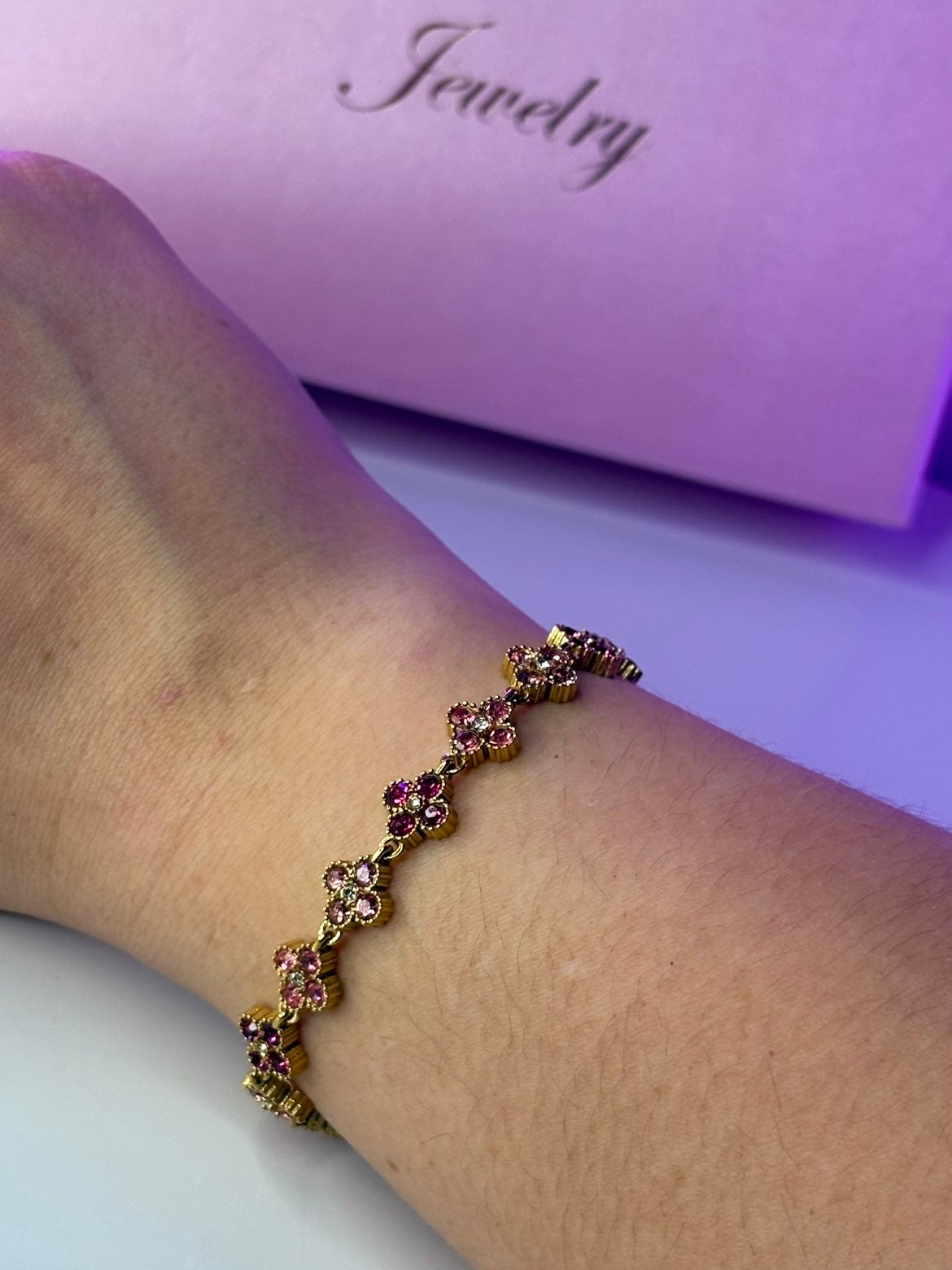 Découvrez la collection Shelby ✨, la pièce phare de notre nouvelle collection qui est déjà en train de faire fureur. Ce bijou unique capture la lumière grâce à ses maillons délicatement travaillés en forme de fleurs étincelantes 🌸, serties de pierres aux nuances de rose éclatantes 💕. Monté sur une structure dorée raffinée 🌟, le bracelet Shelby apporte une touche de luxe et de féminité instantanée à votre poignet 👑